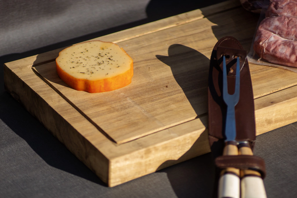 El combo asado se compone de un juego de asador (pinche y cuchillo) y una tabla de asado.
