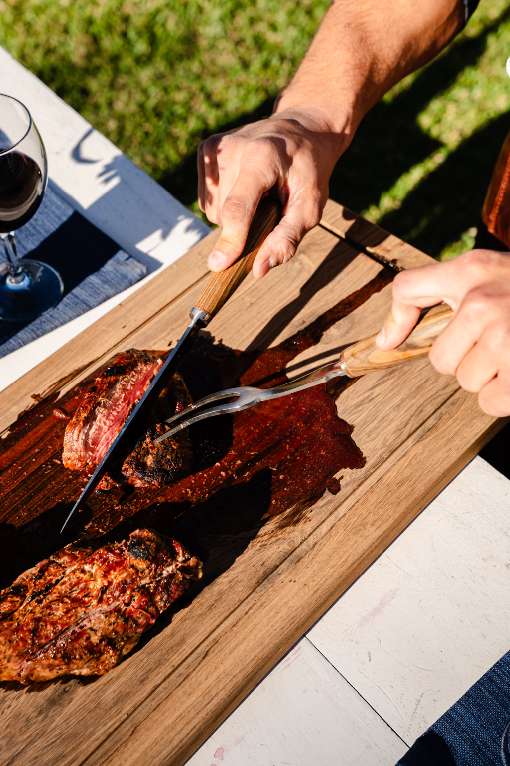 El juego de asador esta encabado con un mango de hueso de vaca y madera de guayubira de alta calidad.